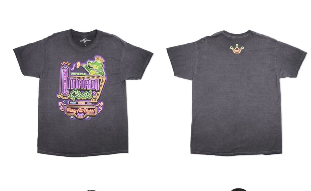 Featuring bold neon graphics with “Universal Mardi Gras 2026” plus musical notes, beads, and a crowned gator, this cotton tee is great for everyday.